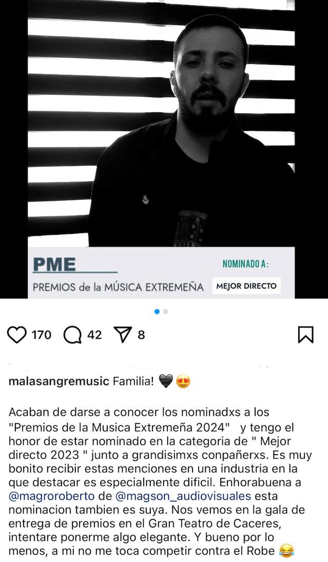 Malasangre compite en la categoría de Mejor Directo junto a Rack Roll & The Remayteds, Niño Índigo y Pitera. El artista en sus redes sociales ha señalado que es muy bonito recibir este tipo de menciones en una industria en la que destacar es especialmente difícil. «Y bueno, por lo menos, a mí no me toca competir contra el Robe», bromea. También ha querido agradecer a su equipo técnico de sonido ya que «esta nominación también es suya».