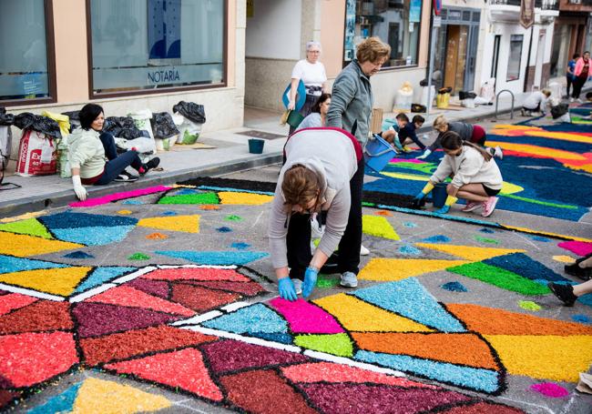 El 2 de junio siete calles y dos plazas se llenarán de arte efímero con 5.500 kilogramos de viruta de madera, 2.000 kilos de sal entrefina y fina, 2.800 litros de tintes y hasta 3.000 kilos de serrín de corcho