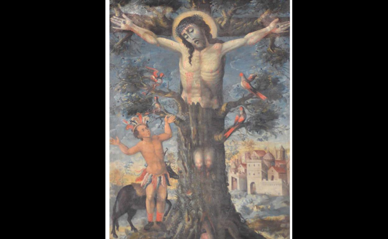 Esta joya pictórica de magnífica calidad conecta las culturas de un lado y otro del Atlántico a través de la representación de Cristo emergiendo del tronco de un árbol, teniendo su origen iconográfico en la leyenda del Cristo de Limache en Chile hacia 1646. Ésta narra cómo alguien quiere talar un árbol y aparece una imagen de Cristo Crucificado. Sin embargo, las obras extremeñas (Ceclavín, Valencia de Alcántara o Cáceres) se basan en una leyenda de conversión de un indiano de Ceclavín llamado José Sánchez de Bustamante que emigra a Copacabana (Bolivia), donde construye una hacienda y contrata a dos hermanos lugareños, Tupac y Yupanqui. Este último se convierte al cristianismo, algo que enfurece a Tupac y se ensaña con el árbol bajo cuya sombra estaba enterrada la esposa del extremeño Sánchez de Bustamante. Al talar el árbol aparece una imagen de Cristo Crucificado y provoca que Tupac también se convierta al cristianismo. Lógicamente, en el contexto extremeño, el árbol del que brota la imagen de Cristo es una encina, de ahí el nombre de esta iconografía.