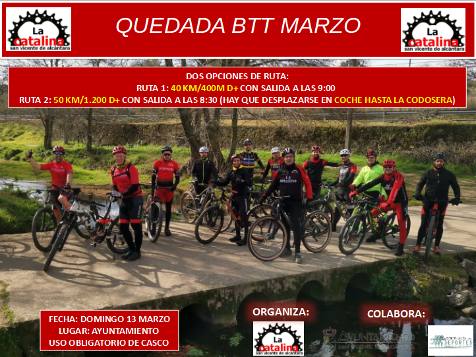 Como mensualmente se viene haciendo la asociación CC La Catalina organiza una quedada BTT, que se divide en dos variantes con diferentes niveles de dificultad, para así tratar de dar cabida a todos los públicos –una destinada aquellos que tienen una mayor preparación y otra para los que tienen un nivel amateur-.