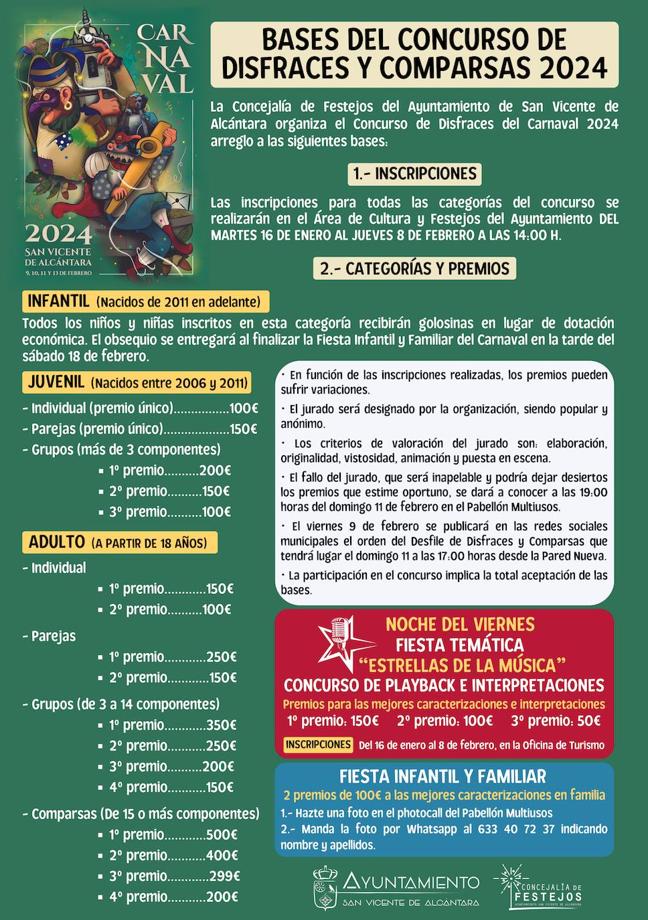 El plazo establecido para las inscripciones se alargará hasta el próximo 8 de febrero, y que se realizarán en el Área de Cultura y Festejos del consistorio sanvicenteño, de lunes a viernes de 8 a 15 horas. También se facilita la inscripción a través del número de WhatsApp 633 40 72 37.