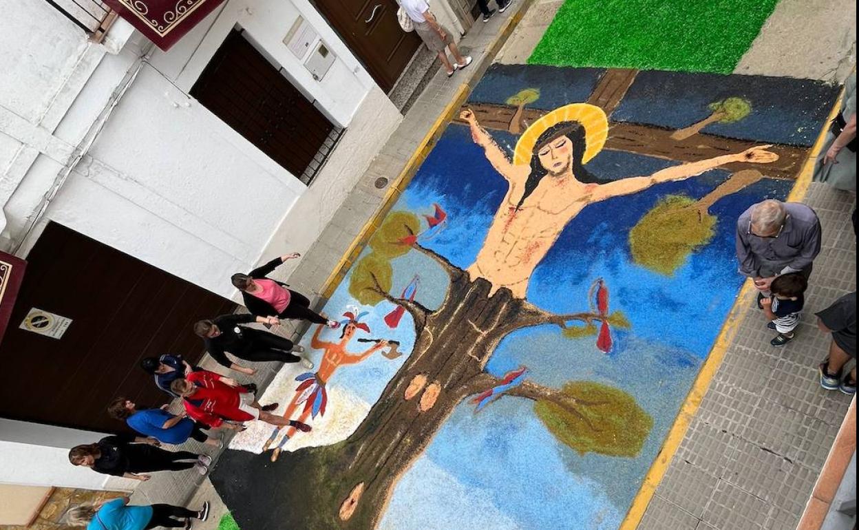 Este año han primado los diseños florales y diferentes representaciones religiosas. Una de las alfombras recogía un mensaje de paz para la guerra de Ucrania, y como novedad, representaron el escudo de la localidad y una decoración con elementos en relieve.