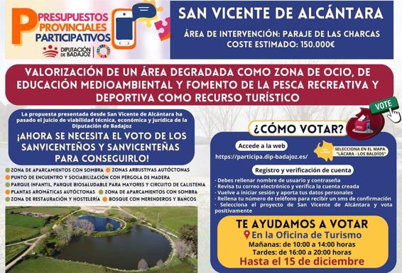 Una vez que la Diputación de Badajoz ha dado su aprobación técnica, económica y jurídica, todo queda en manos de la ciudadanía sanvicenteña y de su delegación territorial (localidades de la comarca Lácara-Los Baldíos). Hasta el próximo 15 de diciembre podrán dar su apoyo a la propuesta local a través de la web https://participa.dip-badajoz.es/, donde habrá que registrarse, verificar la cuenta y votar las propuestas.